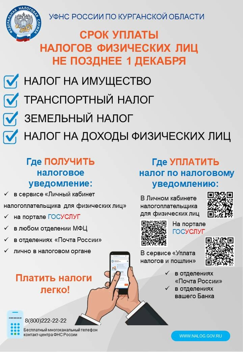🔔 В Курганской области продолжается ежегодная рассылка налоговых уведомлений на уплату налога на имущество, земельного, транспортного налогов и налога на доходы физических лиц за 2024 год